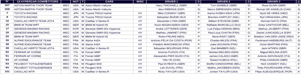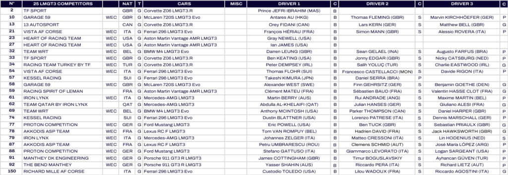 Klasa LMGT3 obejmuje 18 pełnosezonowych zgłoszeń World Endurance Championship, cztery automatyczne zaproszenia i trzy dodatkowe zaproszenia od ACO. Łącznie 25 zgłoszeń, o jedno więcej niż rok temu.