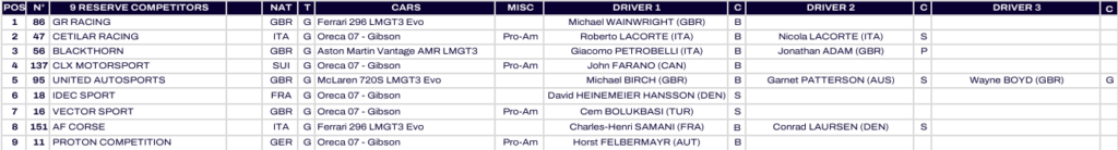 ACO zawsze prezentuje również kilka zgłoszeń na liście rezerwowej. Jest to działanie prewencyjne w przypadku nagłego wycofania się jakiegoś zespołu z udziału w wyścigu. Tym razem mamy dziewięć zgłoszeń, z czego żadnego w klasie Hypercar (co nie powinno dziwić), pięć LMP2 oraz cztery LMGT3. Jest w niej m.in. Cetilar Racing, czyli zespół ojca Nicoli Lacorte, który będzie rywalem Maćka Gładysza w Formule 3.