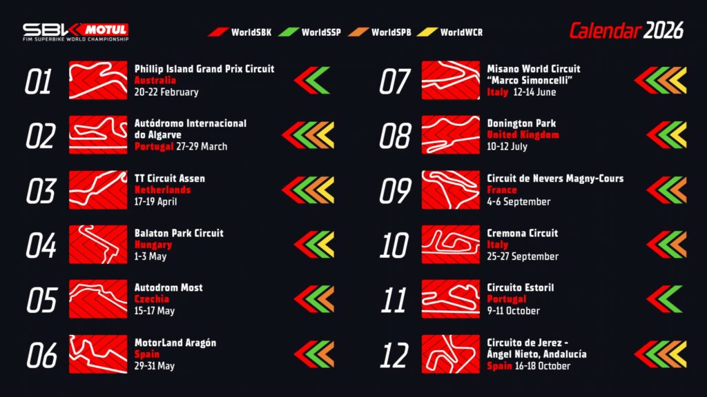 Sezon WorldSBK jest krótszy niż MotoGP, ale pojedynczy weekend wyścigowy oferuje znacznie więcej ścigania. Podczas jednej rundy zawodnicy biorą udział w trzech wyścigach: dwóch długich oraz krótkim sprincie Superpole Race. Taki format sprawia, że punktów do zdobycia jest więcej, a różnice w klasyfikacji generalnej mogą zmieniać się bardzo dynamicznie. Od 2026 roku wchodzą kosmetyczne zmiany czasowe, które od teraz pozwalają obejrzeć jedną, jak i drugą serię jedna po drugiej.